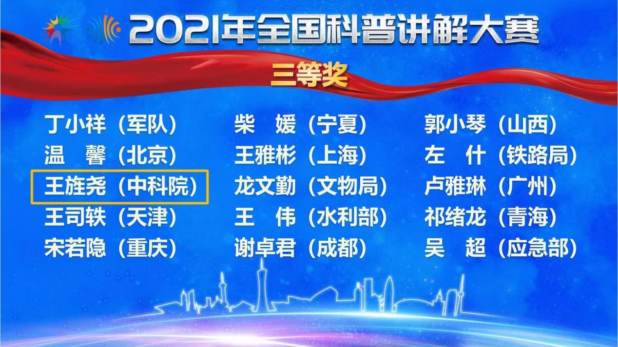近日,延期举办的2021年全国科普讲解大赛总决赛在广州举行,比赛采取线上视频展示结合线下专家评审的形式,共有全国各地76个代表队232名选手参与其中。本届参赛选手涵盖多龄段、多层次、多领域,来自社会各领域,经过层层选拔,=>乐彩汇王旌尧的参赛作品《中国碳卫星》荣获全国三等奖,这也是全院及我所在全国科普讲解大赛中取得的最好成绩。