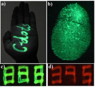图为. 用所制备的碳纳米点荧光墨水在皮肤表面留下的荧光图形(a)和在纸上留下的荧光指纹印(激发波长420 nm)(b);用所制备的碳纳米点荧光墨水和商用荧光墨水构筑的具有信息加密的荧光数字((c)激发波长450–480 nm,接收大于515 nm波长的光;(d)激发波长510–550 nm,接收大于590 nm波长的光)。