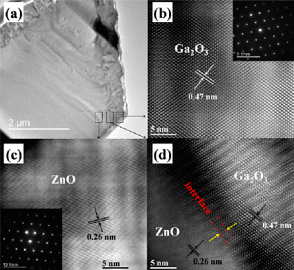 氧化锌/氧化镓核壳结构微米线采用一步CVD生长法制备。这种方法所生长的核壳结构微米线,核层氧化锌和壳层氧化镓都是高晶体质量的单晶,并且两种材料的界面非常陡峭,无明显界面缺陷和位错的存在。通过在核层与核层分别制备金属电极,就构成了异质结结构的日盲紫外探测器件。器件的响应峰值在254 nm,响应截至边266nm,对日盲紫外光具有高灵敏度、高探测度、高量子效率和高速的响应。在-6 V的电压驱动下,器件的明暗电流比可以达到106以上,响应度可达到1.3×103 A/W, 探测率为9.91×1014 cm·Hz1/2/W,响应时间小于20 μs,该结果为目前同类器件当中性能最好的结果,其主要性能高于目前商业Si雪崩二极管。通过对器件的性能进行了深入的研究,发现器件具有雪崩增益,其增益高达104。