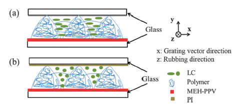 采用两束相干光照射单体和液晶混合的预聚物,在干涉条纹亮区单体发生聚合形成聚合物,由于浓度梯度液晶向暗区移动,单体向亮区移动,最终形成液晶层和聚合物层交替排列的周期结构,即液晶/聚合物光栅。采用低曝光强度制备的光栅无液晶微滴、散射低。由于暗区残余的单体发生反应形成聚合物拉丝使相分离出的液晶分子沿着光栅矢量方向排列,导致折射率调制量很小,光反馈能力不强。直接对现有的预聚物体系进行摩擦取向,效果不理想。