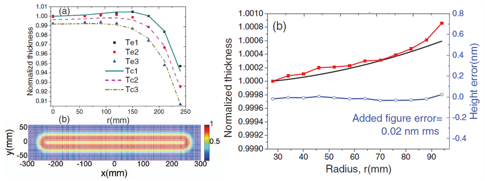 极紫外多层膜反射镜是极紫外光刻系统的核心光学元件。极紫外光刻系统需要高性能的极紫外多层膜,包括高反射率,低应力,高稳定性和高均匀性。对于极紫外光刻系统中的投影物镜,必须对镀制在其上的极紫外多层膜进行超高精度的膜厚分布控制,以便实现波长匹配和减小镀膜引起的面形误差。