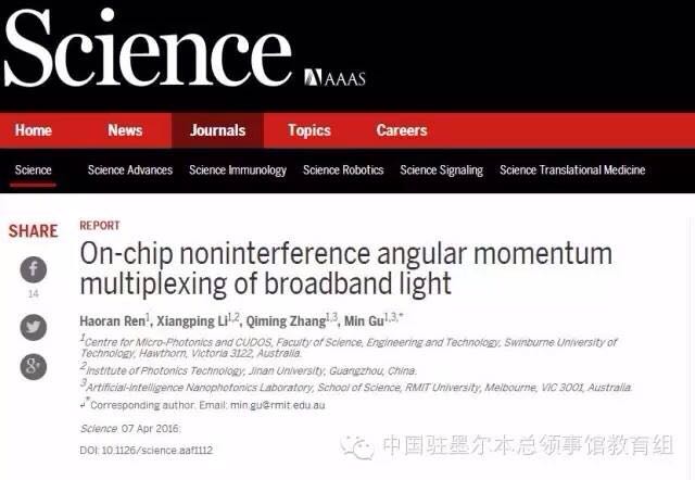 Light国际编委、澳大利亚皇家墨尔本理工大学顾敏院士领导的研究团队首次利用光学芯片实现了纳米尺度下对光子角动量的操控。相关成果以《On-chip Noninterference Angular momentum Multiplexing of Broadband Light》 为题,于2016年4月7日在《Science》上在线发表(DOI: 10.1126/science.aaf1112)。这项发明是光信息技术领域的一次重大突破,其提供的全新光子角动量编码技术有望应用在超快速光通信、超高清显示、超安全信息加密、超高效量子通信及量子计算等各个领域。