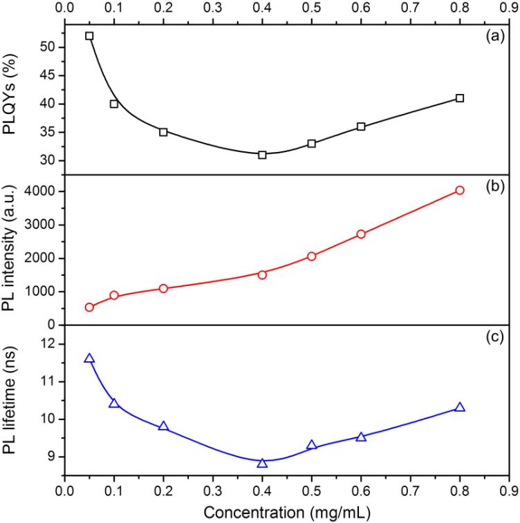 碳纳米点@二氧化硅复合材料的(a)荧光量子效率、(b)荧光强度、(c)荧光寿命随碳纳米点乙醇溶液浓度的变化曲线。