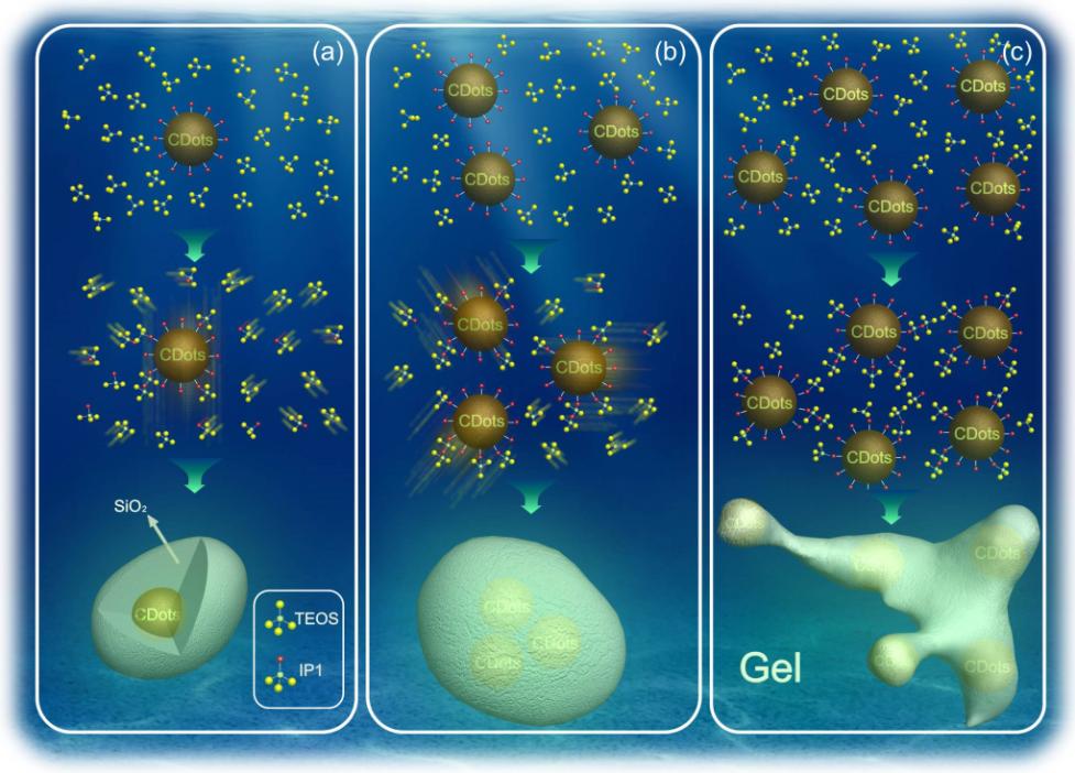 不同浓度的碳纳米点与二氧化硅形成复合材料的制备过程示意图。
