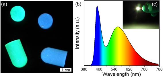 (b)颜色转换层材料为碳纳米点与二氧化硅高效复合材料的发光LEDs的(b)发光光谱和(c)照片。