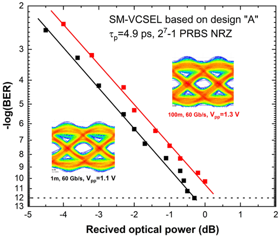 图2、100 m长光纤条件下VCSEL基于NRZ调制的60Gb/s眼图和误码。