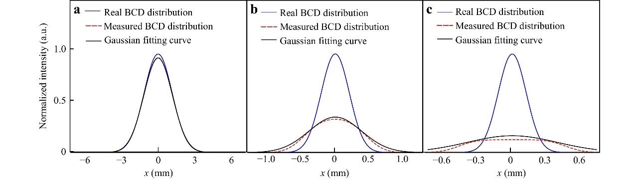 结合法拉第杯扫描原理,研究团队详细分析了离子束流测量的误差来源,发现其主要是由法拉第杯小孔所产生的卷积效应有关。在卷积效应的影响下,通过小孔测得的离子束流分布会呈现峰值减小与半高宽扩张,产生“退化”现象,且此与离子束流和法拉第杯小孔之间的相对关系密切相关。当两者之间的比值越小,卷积效应越发明显。
