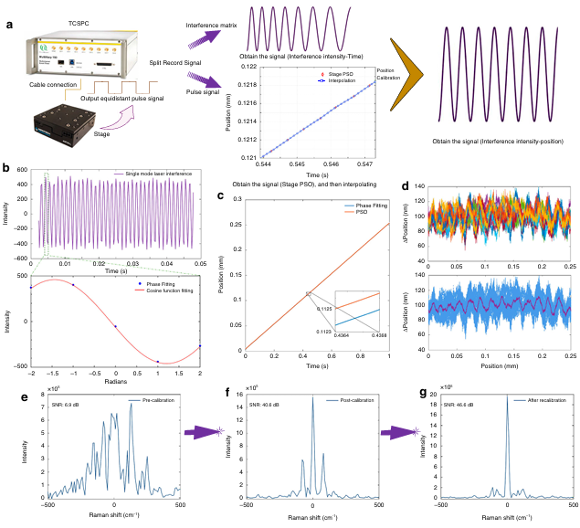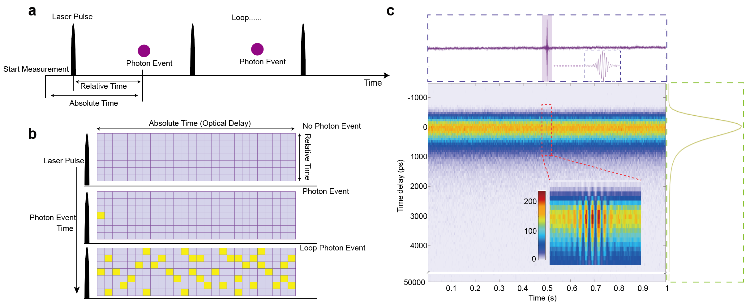 研究团队采用马赫曾德尔干涉仪结合高精度直线电机位移台,并与单光子雪崩二极管、单光子计数器时间标记采集配合使用(图1),允许将光子事件按照发生绝对时间和相对时间顺序放置在光子矩阵中(图2a,b)。该矩阵横轴叠加为干涉强度曲线,纵轴叠加为荧光寿命曲线(图2c)。