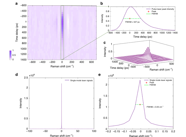 为了确定系统整体时间分辨率和光谱分辨率,研究团队首先使用脉冲激光测试其时间分辨率。从脉冲激光谱线2D、3D热图(图4a,c)中可以看出该仪器实现了547 ps的时间分辨率(图4b)。其次使用连续激光测试系统最大光谱分辨率,从图中可以看到系统最大可实现的光谱分辨率为0.05 cm-1(图4d,e)。