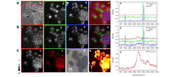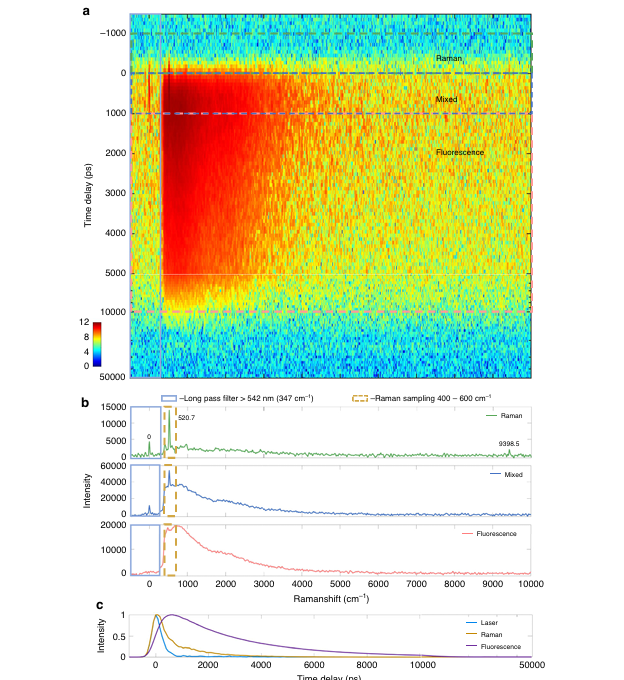 为了验证系统的拉曼荧光信号分离能力。团队使用在表面涂覆荧光材料的硅片进行实验(R6G-PVA-Si)。图5a为样品扫描结果热图(时间延迟 -1000-50000ps.光谱范围为-500-10000cm-1)。将热图按照时间延迟进行区域划分可以设置为拉曼区域,拉曼荧光混合区域,荧光区域。图5b为不同区域的光谱均谱。可以看到在拉曼区域有明显的硅峰信号,而随着时间延迟增大,荧光信号开始显现,直到无法看到硅峰信号。结果证明了系统的拉曼荧光分离能力。