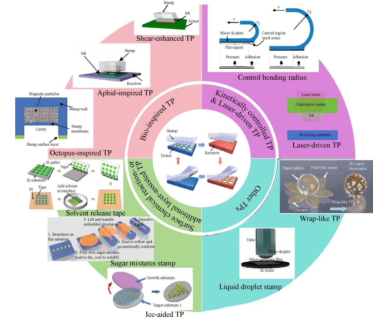 硅基光子学作为高性能光芯片的主流平台,其发展长期受制于一个根本性难题:硅材料无法高效发光,难以实现片上激光器与放大器。为此,学术界与产业界致力于将发光的III-V族半导体与硅光芯片集成,但传统方法各有局限——外延生长得到的器件性能稳定性有待提升,晶圆键合虽然适合高密度集成但存在工艺兼容问题,倒装芯片则成本高、精度受限。近年来,转印集成技术成为突破上述瓶颈的关键路径。该技术利用弹性印章“拾取”已制备好的III-V器件,并精准“打印”至硅基光芯片上,兼具高精度、高效率和工艺兼容性优势,已成功应用于多种高性能硅基与氮化硅基半导体激光器、光放大器和探测器等核心功能元件的集成,为拓宽光子集成电路的应用范围奠定了坚实的技术基础。
