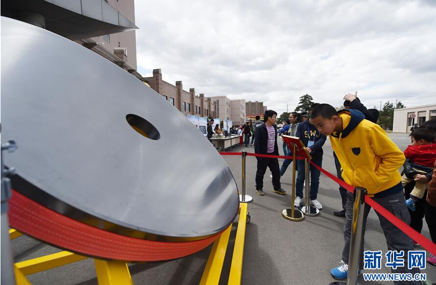 4月23日,市民在=>乐彩汇参观展出的直径两米单体碳化硅反射镜坯,它是航空、航天相机或地基望远镜的反射镜材料。新华社记者 张楠摄