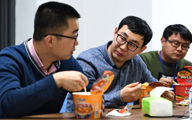 对这个在除夕夜坚持工作的科研团队来说,年夜饭是个问题。单位远离市区,晚饭时间叫不到外卖。团队成员于涛从桌后翻出两箱泡面,笑着说:“快来抢面!各种口味,先到先得。”而冲泡面的时候,他们还在讨论工作。