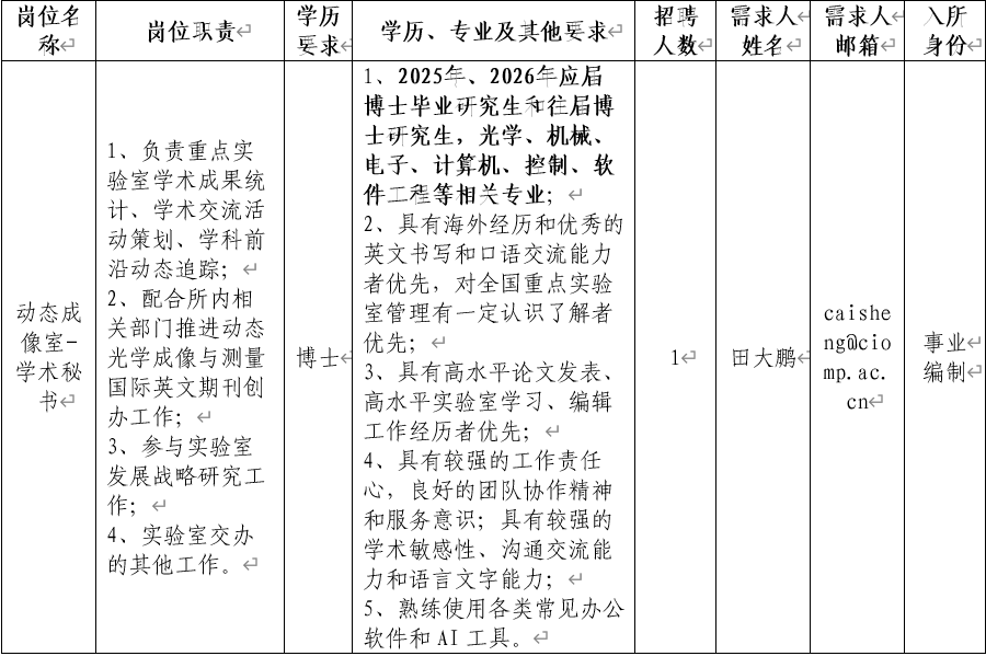 学术秘书(动态成像室,入所身份为事业编制人员),详情如下: