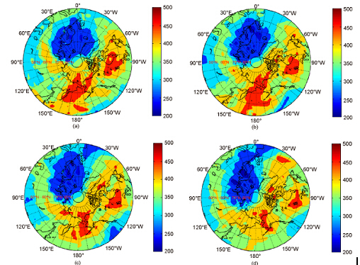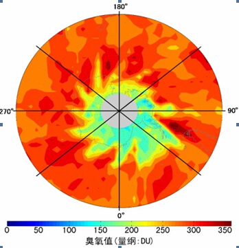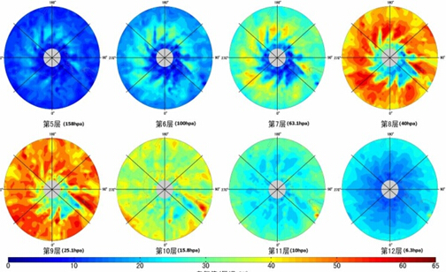 截止目前,该载荷已在轨正常运行5年,大大超过了3年设计(2年考核)工作寿命的要求。在轨运行五年以来,SBUS利用12个通道的观测数据获得从地表到大气顶共计21层臭氧含量信息。通过FY-3 SBUS地面产品生成系统逐日自动生成紫外臭氧垂直廓线产品,应用于监测全球大气不同高度层的臭氧分布及其变化,为评估人类活动对大气臭氧分布的影响及气候模式计算等提供基础数据。如利用该探测仪获得的臭氧总量数据生成的南极极射投影图(图1)和不同高度层臭氧分布的南极极射投影图(图2)。获取的数据不仅可以给出南极地区臭氧总量低值的分布状况,更可以看出不同高度层低值分布的细节,使人们对南极臭氧低值分布的认识从平面扩展到立体。特别是2011年春季,北极地区发生了有史以来最严重的臭氧损耗事件。中国气象局利用紫外臭氧垂直探测仪(SBUS)监测了此次臭氧低值事件发生、发展、消亡的具体变化过程(如图3)。这是我国第一次利用国产卫星监测到的全球大气臭氧重大异常变化。