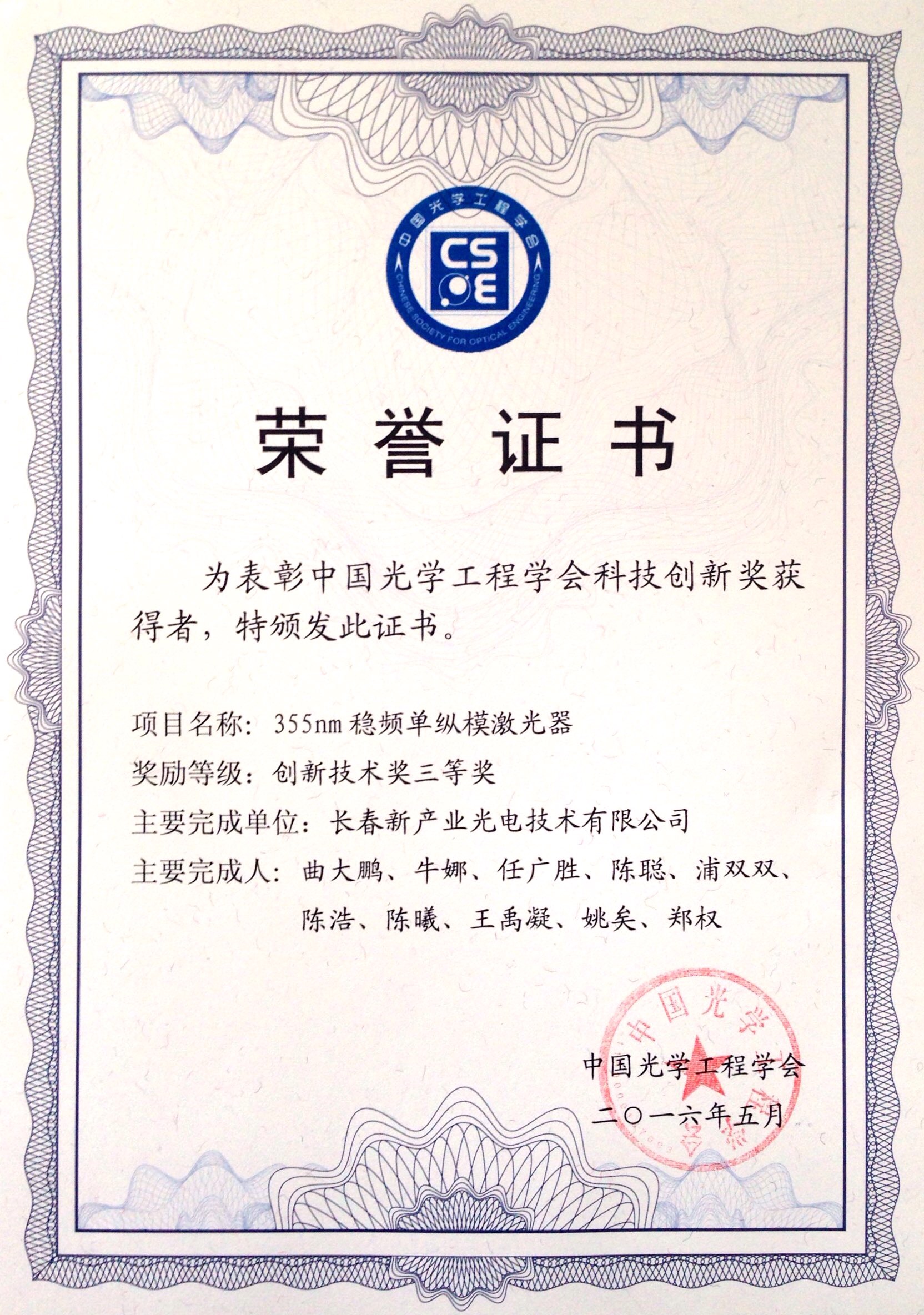 在由中国光学工程学会举办的“2016年度中国光学工程学会科技创新奖”评选活动中,长春新产业公司“355nm稳频单纵模激光器”产品荣获“创新技术奖三等奖”。