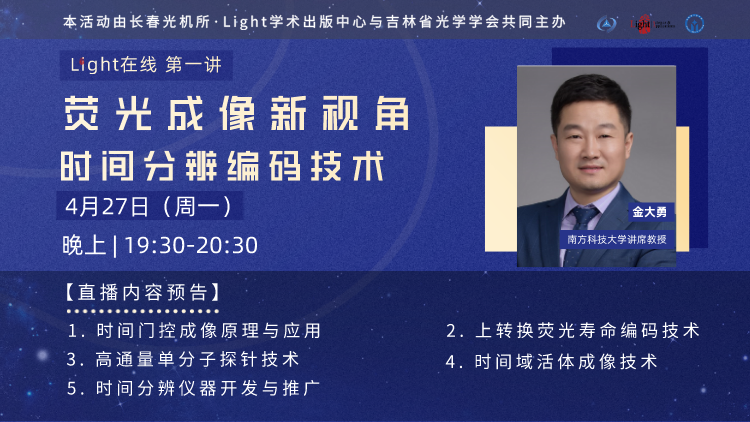 本次直播邀请的主讲嘉宾是南方科技大学的金大勇教授。本次活动由Light学术出版中心新媒体主管赵阳担任策划执行以及直播主持人。在直播课程中,金大勇教授介绍了一种不同于荧光颜色分辨的荧光时间分辨检测成像技术,主要从时间分辨技术背景、上转换荧光材料荧光寿命、检测成像原理、时间分辨仪器设备、时间分辨小动物活体成像、时间分辨分子探针检测等方面进行了全面讲解。本次直播课程形象生动、深入浅出、互动性强,获得了现场观众的一致好评。课程结束后,金大勇教授针对观众提出的部分问题进行了详细解答,现场学术氛围热烈。