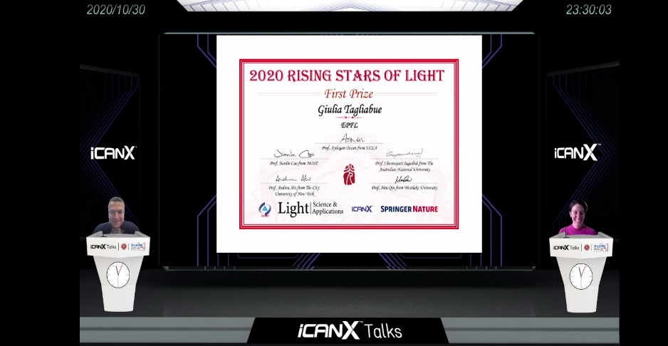金秋10月,由国际知名光学期刊《light:Science & Applications》主办的一年一度顶尖光学青年科学家竞赛“Rising Stars of Light”的2020决赛于10月23日和30日联合国际领先的学术平台iCANX,在虚拟现实场景下,历经2场累计8小时激烈而友好的比拼,在全球50多万观众的见证下,经过“未来之星”评选委员会的慎重选择,最终来自瑞士洛桑联邦理工学院的Giulia Tagliabue博士获得了一等奖,来自美国国家标准研究院的Amit Agrawal博士和科罗拉多大学博尔德分校的Shuo Sun博士获得了二等奖,来自美国斯坦福大学的Avik Dutt博士,来自美国范德堡大学的Justus Ndukaife博士和瑞士洛桑联邦理工学院的Junqiu Liu博士获得了三等奖,来自中国复旦大学的Shulin Sun博士,美国麻省理工学院的Yi Yang博士,加州大学伯克利分校的Sui Yang博士和新加坡国立大学的Guangwei Hu在读博士获得了候选人奖。
