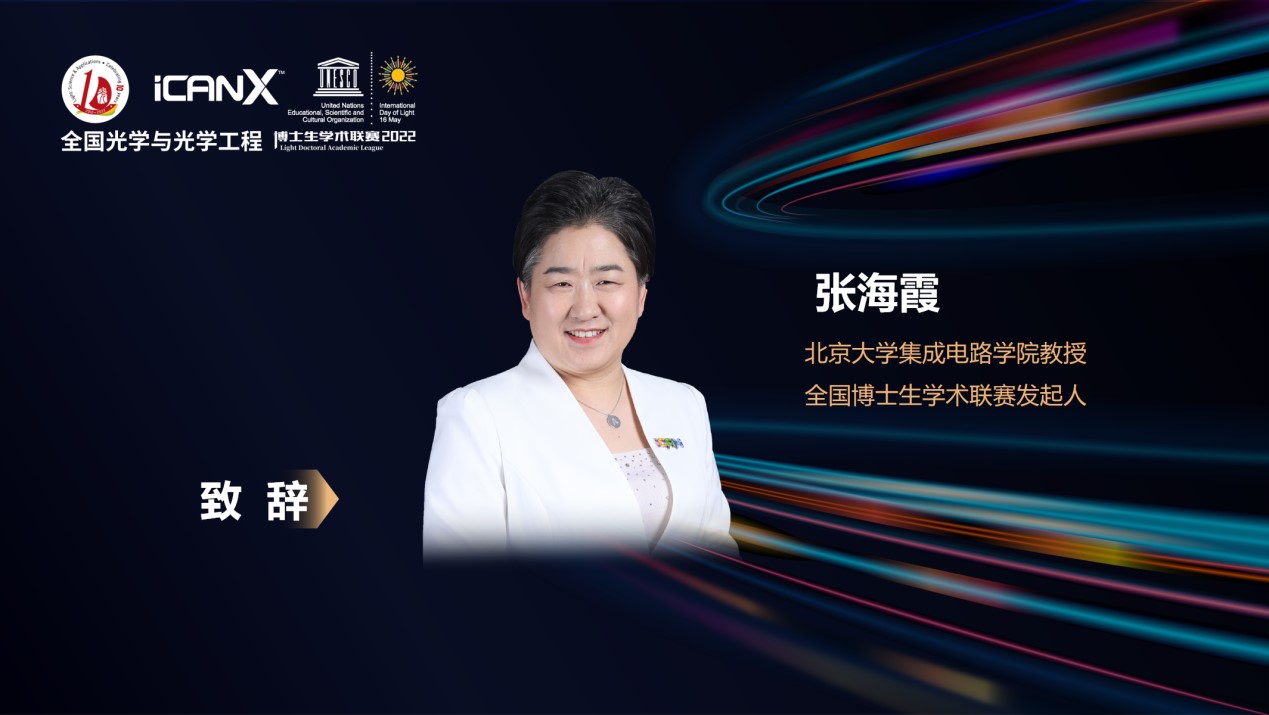 iCANX创始人、北京大学张海霞教授致辞,她表示,学术联赛是一次美好的梦想照进现实!期待所有的青年选手在舞台上充分展现才华,联赛所提倡的这种科研精神是中国现阶段最需要的,这些年轻人代表着中国的未来!