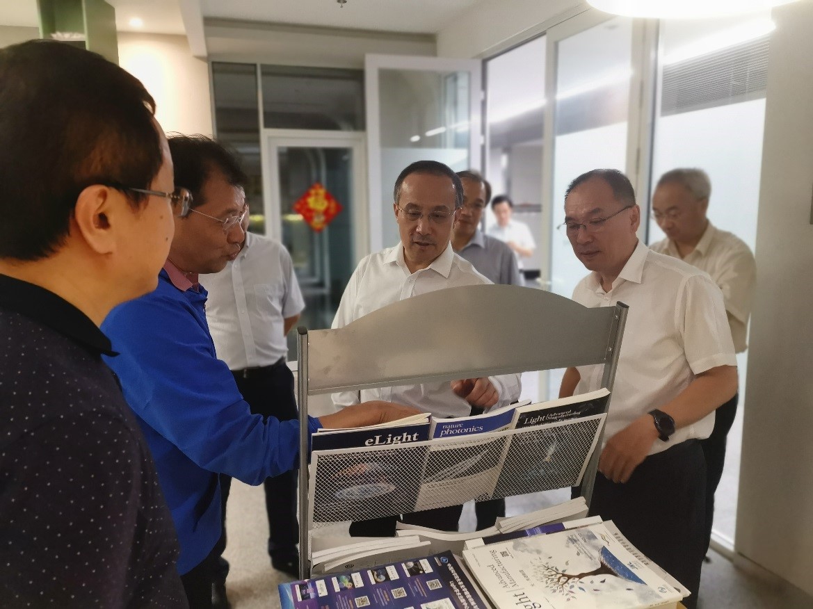 张涛一行参观了研发大厦、光栅楼、大珩楼、光学中心、博大楼等办公与科研场所,听取了本所在科研管理、技术创新、条件建设、期刊出版等领域的重要举措、重大成果及研究进展。