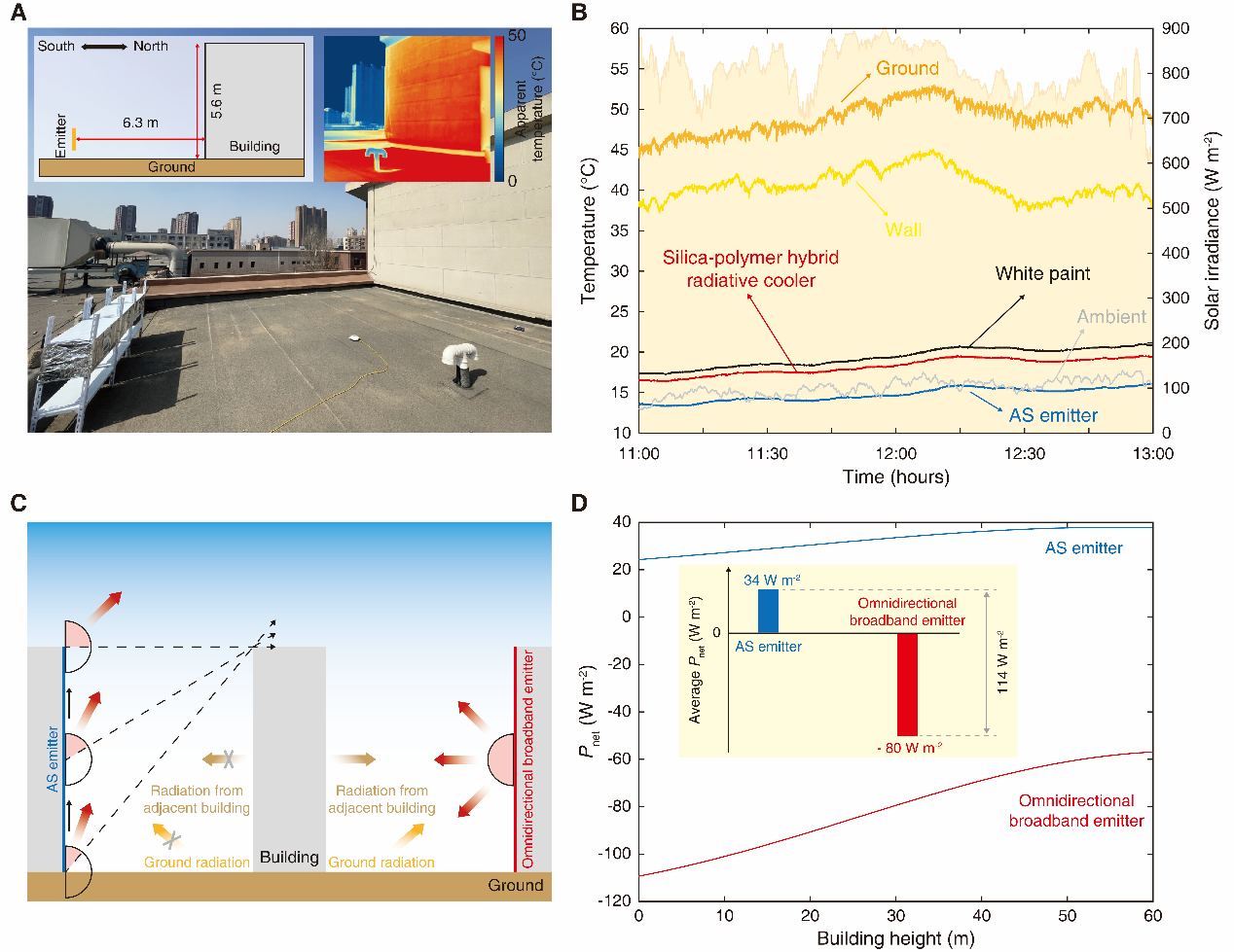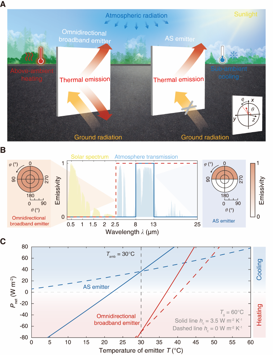 以辐射制冷为例,过往的辐射制冷器件通常呈现出全向的热辐射特性,因此仅适用于开阔的水平表面(如屋顶),以便最大限度的面向温度较低的天空,并尽可能的隔绝器件与地面、周围物体、大气非透明窗口波段向下辐射等的热量交换。然而,当它们被用于竖直表面(如墙面、衣物、车辆侧面等广泛实际场景)时,器件面向低温天空的视场角显著缩小,同时不得不大量吸收地面(尤其在亟需制冷的夏日,地表温度远高于环境温度)、周围物体以及大气非透明窗口波段向下辐射等的热量,从而导致其亚环境辐射制冷失效。尽管近年来一些国际研究团队尝试调控热辐射的光谱或角度,但竖直表面的日间亚环境辐射制冷仍然面临着巨大的挑战。