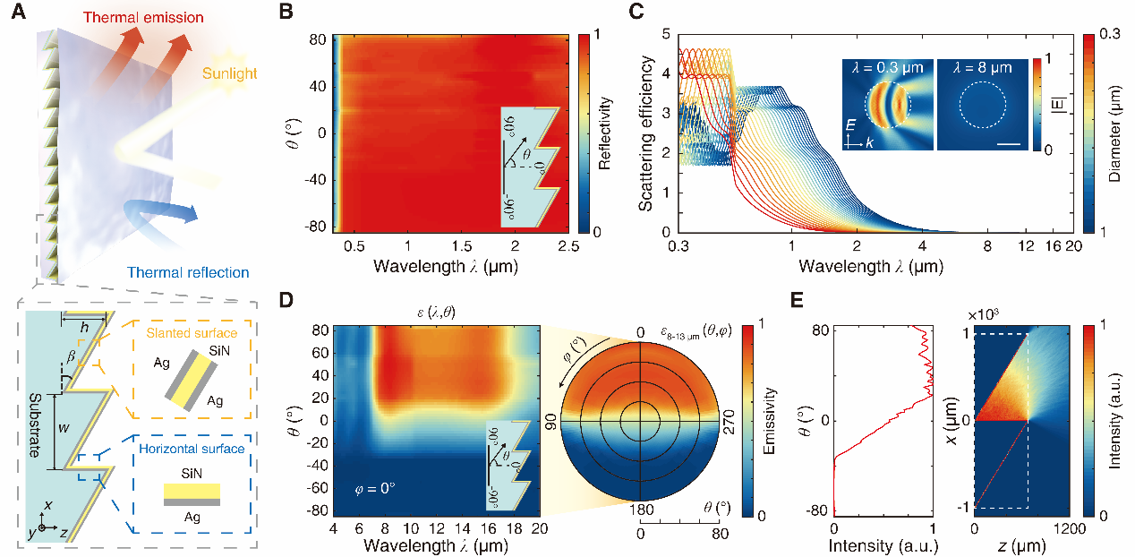 据此,该研究从太阳反射率、大气透明窗口内的光谱选择性、热辐射角度非对称特性协同设计,以热力学、互易性、波导以及声子激化共振等理论为基础,利用跨尺度对称破缺结构实现了热辐射在空间角度上的非对称分布以及在光谱上的选择性调控。