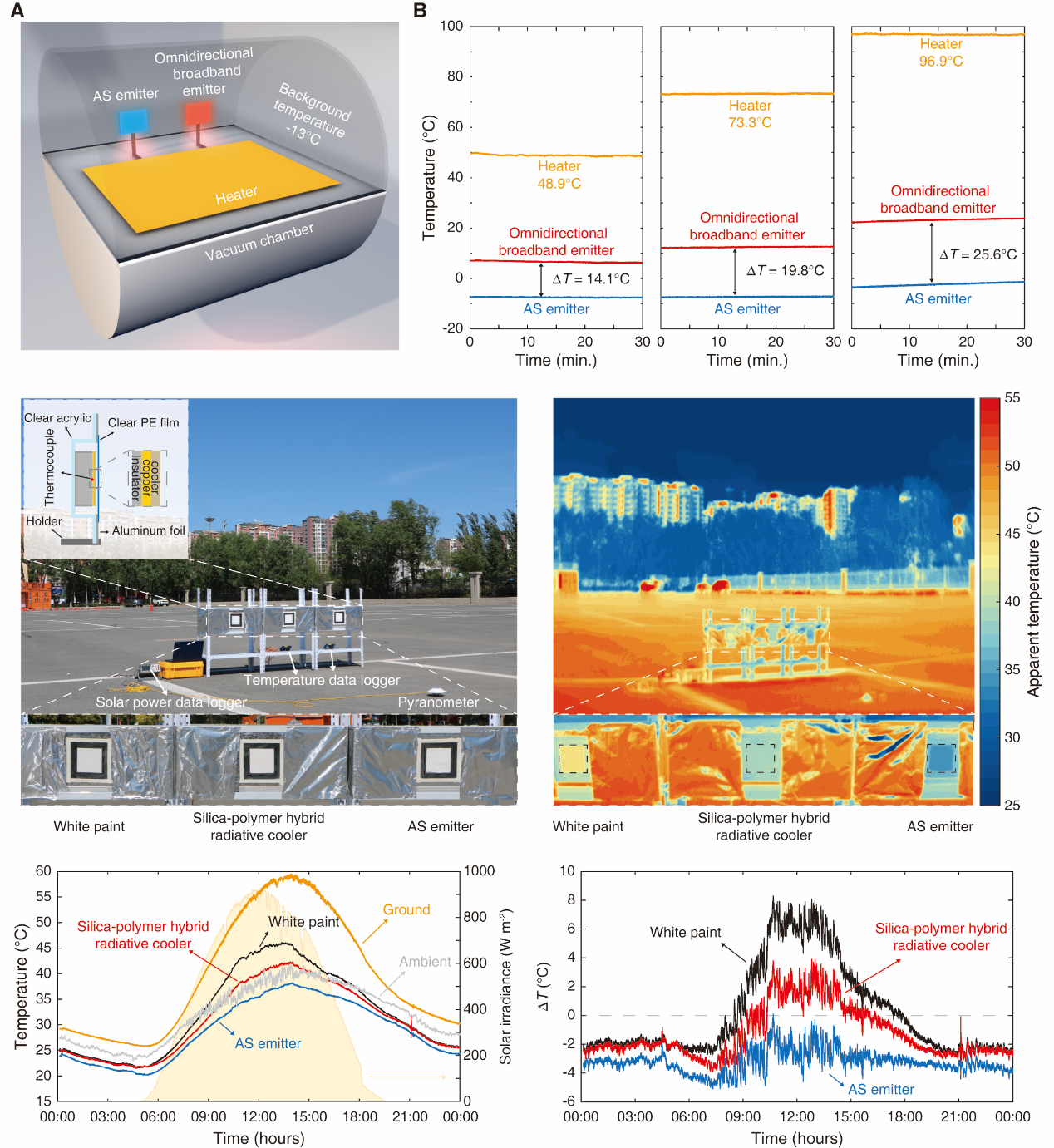 据此,中国科学院=>乐彩汇李炜研究员团队与合作者,利用热光子学手段,实现了热辐射角度和光谱的跨波段协同调控,进而设计出具有跨尺度对称破缺性、角度非对称光谱选择性的定向发射器件(AS 发射器件),实现了竖直表面的日间亚环境辐射制冷。相关成果以“Subambient daytime radiative cooling of vertical surfaces”为题发表于Science,并获3项授权专利。