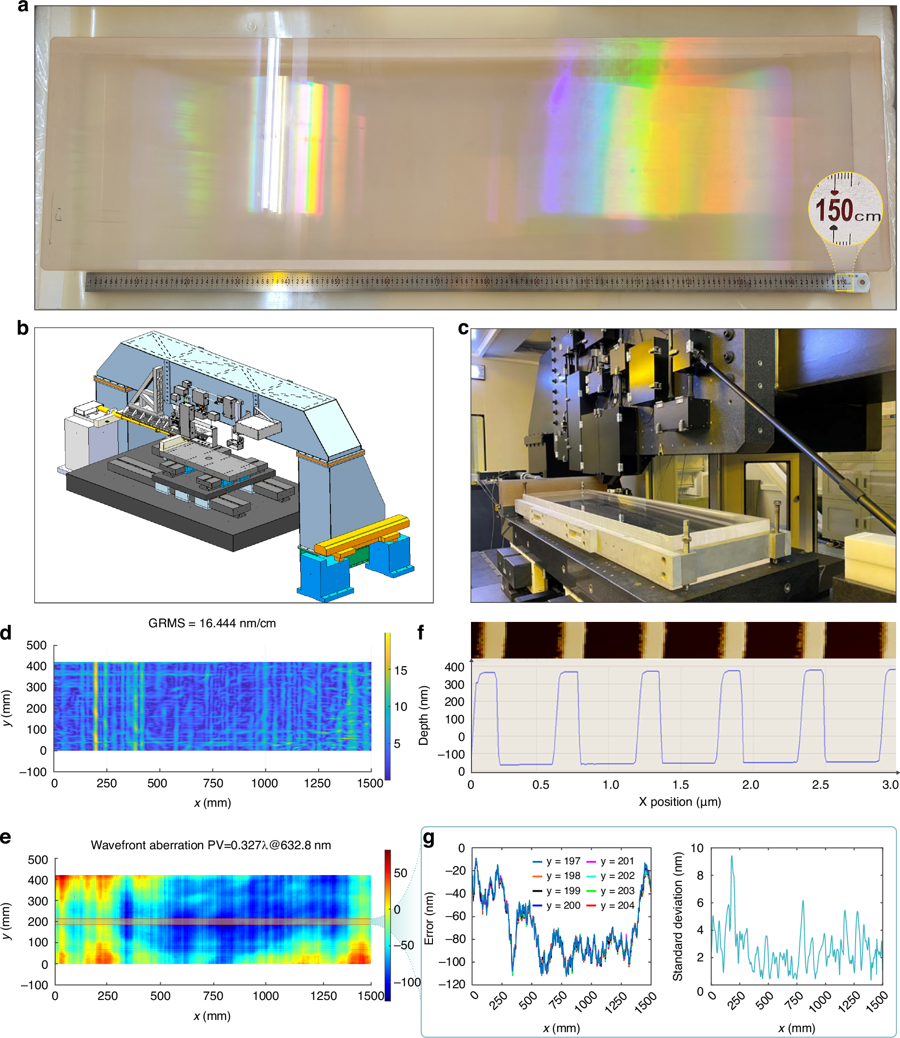图2 研制的大口径高精度全息光栅结果(a 口径为1500 mm × 420 mm光栅实物图,b 扫描干涉场曝光系统原理图,c 扫描干涉场曝光系统实物图,d 光栅衍射波前梯度,e 光栅1级衍射波前,f 光栅刻槽原子力照片,g 光栅刻线误差及其标准差)