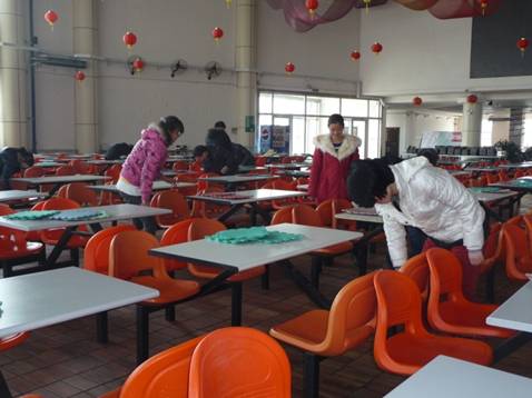 3月10日上午9时,综合班全体同学来到=>乐彩汇职工食堂,此时食堂的工作人员正在紧张的准备午饭,看着工作人员忙碌的身影,同学们不禁跃跃欲试,希望能够为他们提供帮助。