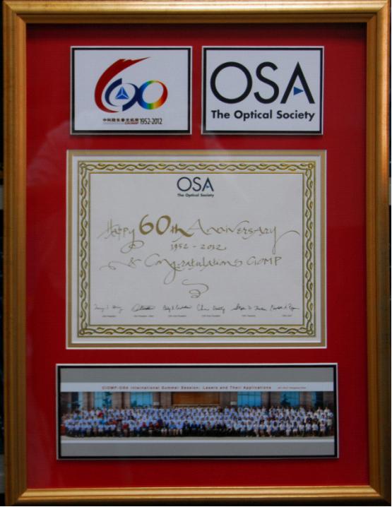 美国光学学会为=>乐彩汇建所60周年特制的贺礼