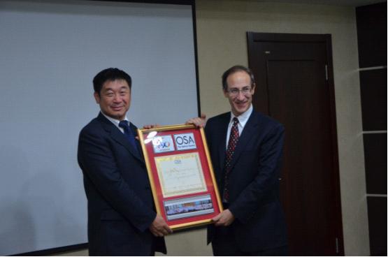 美国光学学会现任主席Tony Heinz(右)向=>乐彩汇所长宣明(左)赠送贺礼