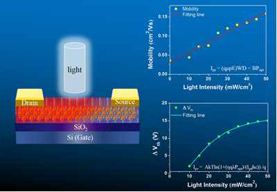 他们利用空间限域、反温度结晶相结合的方法生长出的CsPbBr3薄单晶没有明显的晶粒界畴,厚度在2微米左右,尺寸可以达到毫米级或更大尺寸,便于电子、光电子器件的制备和应用。基于此薄单晶的场效应晶体管在室温下具有双极性,且其载流子传输表现出奇异的光强依赖性:电子的迁移率与光照强度无关,而空穴的迁移率随光照强度的增加而增加;在电子为多数载流子时,阈值电压表现出了光的依赖性,而空穴为多数载流子时却没有这一现象。这是首次在钙钛矿材料中报道这一现象。作者分析认为:这种特殊的传输特性是分别由光电导效应和光伏效应引起的,体现了钙钛矿材料载流子传输机制的特殊性。在50 mW/cm2的光照条件下,所制备的场效应晶体管在室温下具有0.40(0.34)cm2 V-1 s-1的电子(空穴)迁移率,显著优于迄今为止所报道过的基于CsPbBr3钙钛矿材料的场效应晶体管。另外,所制器件也表现了优良的光探测器性能。