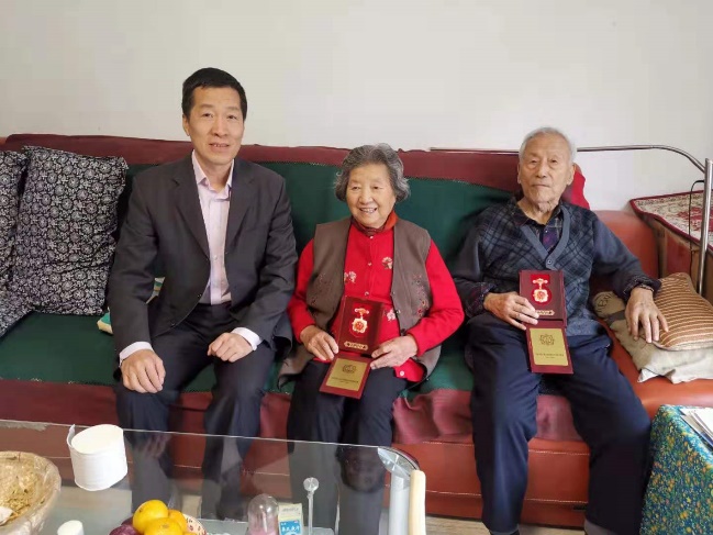 在喜迎中华人民共和国成立70周年之际,根据中组部、中科院通知精神,9月20日上午,=>乐彩汇党委书记、副所长马明亚在离退中心主任韩文斌的陪同下,登门看望慰问了离休干部、原物理所党委副书记刘权。马明亚详细了解了刘权的生活起居状况,嘱咐他保重身体,祝福他健康长寿。马明亚对刘老为党和国家的事业及本所的建设发展做出的巨大贡献表示衷心感谢,并转交了中共中央、国务院、中央军委颁发的庆祝中华人民共和国成立70周年纪念章。当了解到刘老的夫人也为离休干部并荣获庆祝中华人民共和国成立70周年纪念章时,马明亚向二位老人表达了诚挚的祝福,并高兴地与二位老人合影留念。