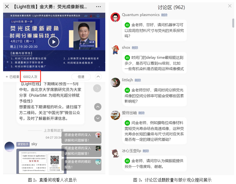 本次直播邀请的主讲嘉宾是南方科技大学的金大勇教授。本次活动由Light学术出版中心新媒体主管赵阳担任策划执行以及直播主持人。在直播课程中,金大勇教授介绍了一种不同于荧光颜色分辨的荧光时间分辨检测成像技术,主要从时间分辨技术背景、上转换荧光材料荧光寿命、检测成像原理、时间分辨仪器设备、时间分辨小动物活体成像、时间分辨分子探针检测等方面进行了全面讲解。本次直播课程形象生动、深入浅出、互动性强,获得了现场观众的一致好评。课程结束后,金大勇教授针对观众提出的部分问题进行了详细解答,现场学术氛围热烈。