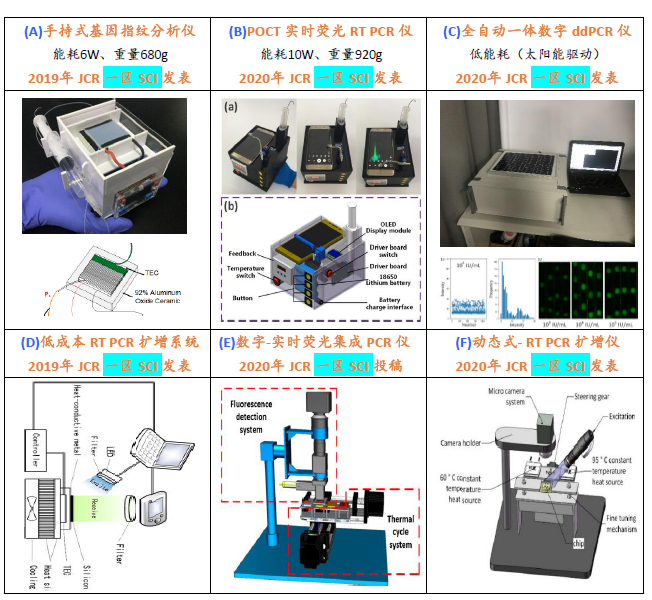 团队成功研发出的低成本RT-PCR系统,实现了对包括乙肝、禽流感、甲状腺因子、麻疹、杆菌等多种靶向基因的实时荧光定量分析。结合芯片光学优化以及温度循环优化,系统还可实现高效的病原菌原位分析。针对于帕尔贴半导体存在的升降温速度慢这一弊端,研发出了一种基于机械位移式的新型RT-PCR定量系统,此系统可实现扩增曲线检测以熔解曲线绘制等一系列功能,不仅提高了温度循环速度,相对于TEC还大大提升了硬件循环温控重复使用寿命,并且降低了整个系统的体积功耗以及重量,同时为快速热循环PCR技术奠定了基础。