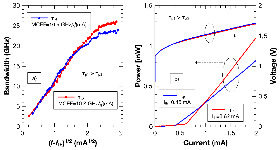 不同光子寿命下(a)VCSEL带宽和(b)L-I-V特性
