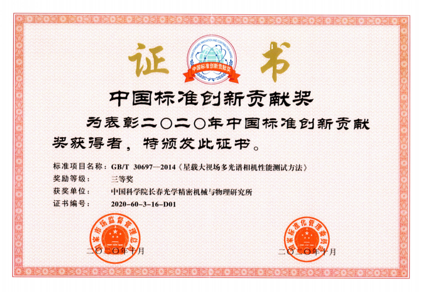 2020年10月14日,正值第52届“世界标准日”之际,中国标准化领域最高奖项中国标准创新贡献奖的评选结果由国家市场监督管理总局正式发布。=>乐彩汇武星星等主持编制的GB/T 30697—2014《星载大视场多光谱相机性能测试方法》荣获2020年度中国标准创新贡献奖标准项目三等奖。