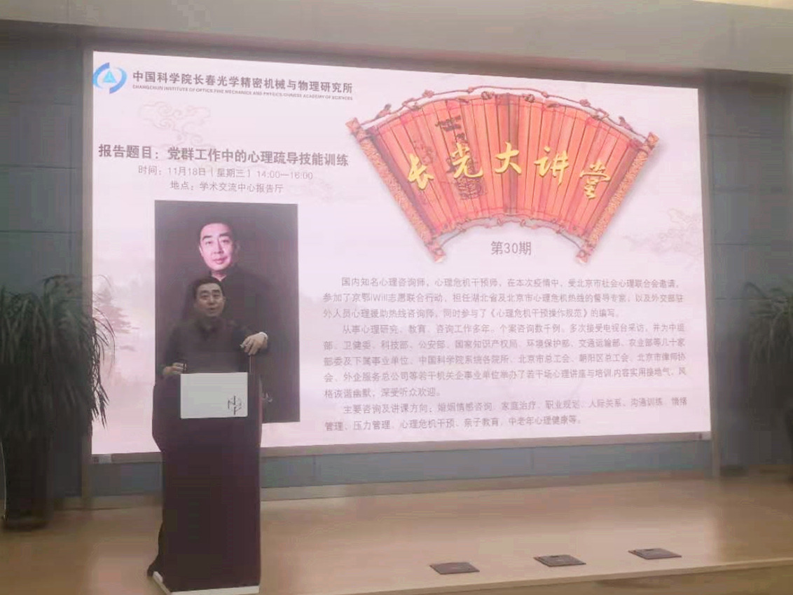 为提高基层党群工作人员的心理疏导能力,11月18日下午,=>乐彩汇“长光大讲堂”邀请国内知名心理咨询师张旸做题为《党群工作中的心理疏导技能训练》专题培训。所各党支部/总支委员、工会主席等120余人参加了培训。会议由=>乐彩汇党委办公室副主任刘本成主持。