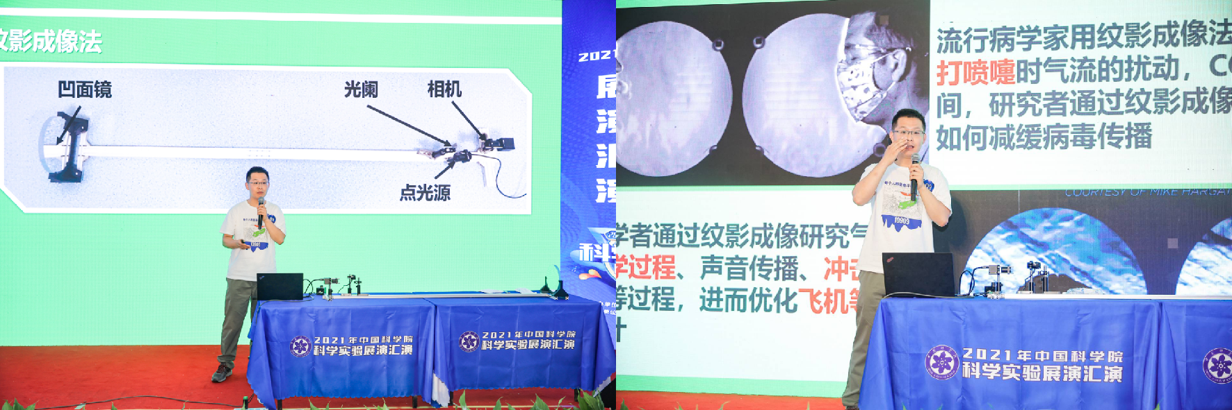 《光之纹影成像法》由应用光学国家重点实验室的2019级博士梁鹏带来,实验全程通过纹影成像装置为公众奇妙展示了正常情况下看不到的气体流动,简明易懂的分析其工作原理,介绍了在疫情期间,通过该成像技术观察口罩对飞沫阻断等实际应用。