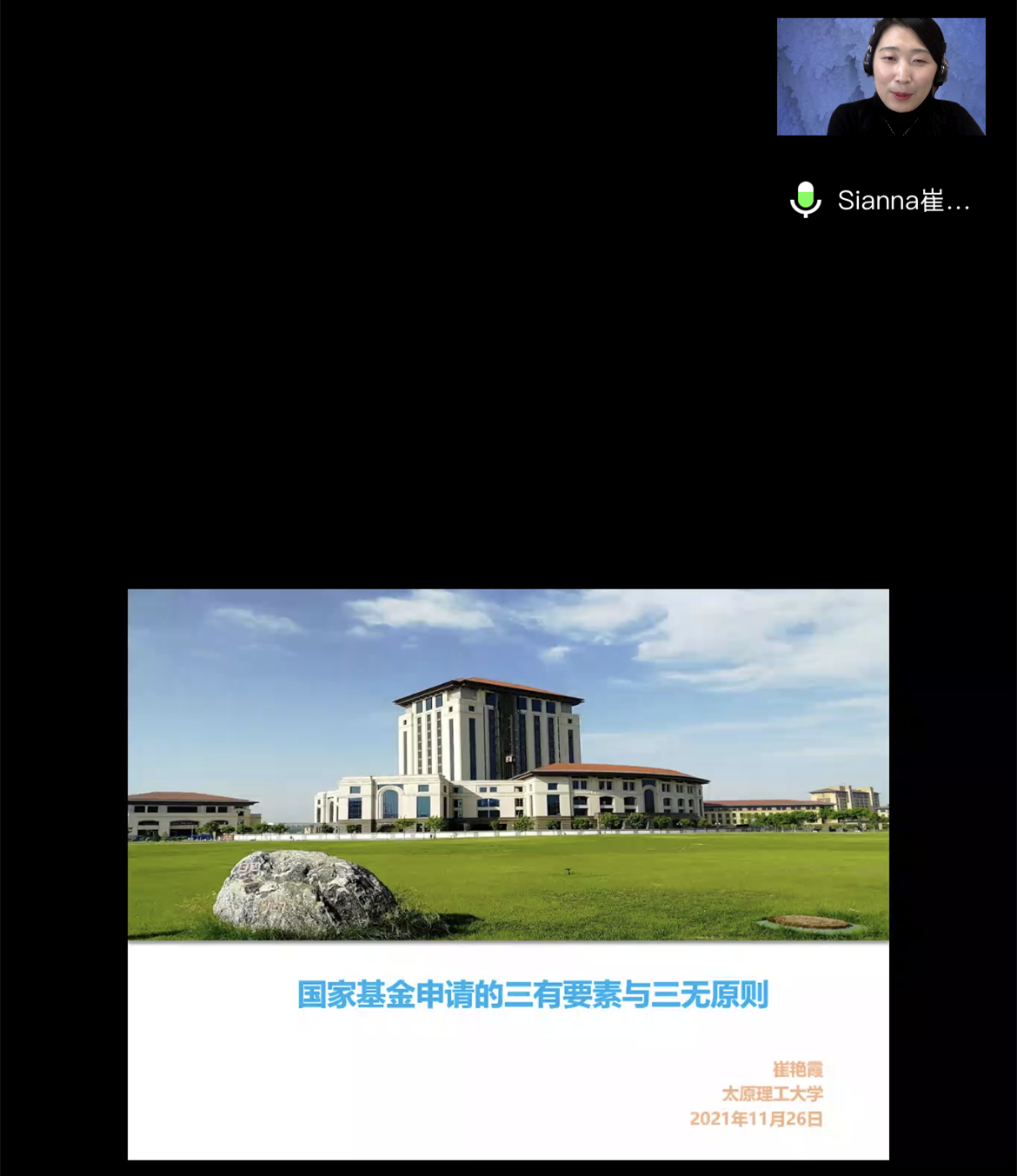 2021年11月26日,应用光学国家重点实验室应光论坛第57期邀请了来自太原理工大学的崔艳霞教授在线分享国家自然科学基金申请经验。崔艳霞倾情分享了申报国家基金的三有要素与三无原则,在2个小时的报告过程中,崔艳霞谆谆道来,细致地介绍了基金选题要“有基础”、“有交叉”、“有共识”,即三有要素,鼓励年轻科研人员保持开放心态,多交流,在选题时建议青年科研人员树立投入毕生精力的毅力,攻克难题,解决有利于国计民生的科学问题。接着,崔艳霞强调了基金撰写中要注重三无原则 “无逻辑断链”、“无粗制滥造”、“无低级错误”。崔艳霞结合了自己基金申请的实际案例,逐个举例分享,将一份国家自然科学基金申请书层层剥开,划重点,讲细节,授技巧。