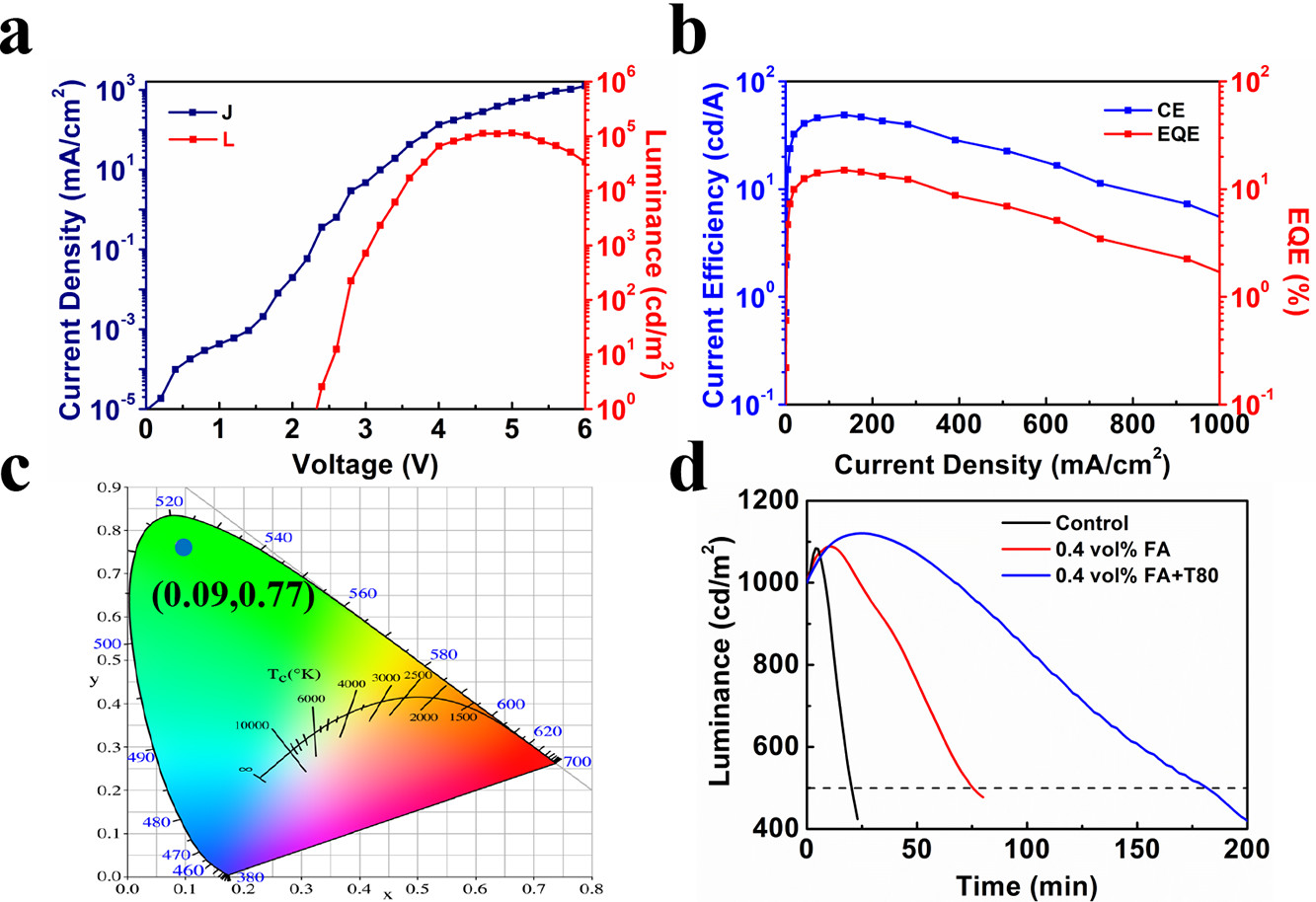 针对这一问题,乐彩汇发光学及应用国家重点实验室的郭晓阳、吕营和刘星元研究团队采用甲酰胺掺杂PEDOT:PSS诱导钙钛矿结晶,提高钙钛矿薄膜的结晶性。同时使用吐温80作为钙钛矿薄膜的钝化剂,有效减少钙钛矿薄膜的缺陷态。获得了结晶取向度好、荧光量子效率高、晶粒尺寸均匀的高质量全无机钙钛矿发光薄膜。在甲酰胺界面处理和吐温80钝化处理的协同作用下,制备的全无机钙钛矿发光二极管外量子效率为15.02%,器件的最大亮度达到了185000 cd/m2,在初始亮度为1000 cd/m2时,器件的运行寿命为182.5分钟。这是目前已报道的全无机钙钛矿发光二极管中性能最好的器件之一。