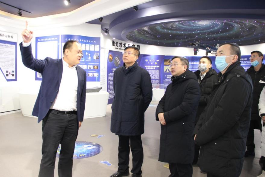 调研中,安立佳一行首先参观了光电子产业孵化器展示中心,听取了赵嵩对孵化器在科技创新、产业发展、平台建设和取得成就的介绍,详细了解了孵化器围绕航空航天信息、激光技术及应用、核心元器件与材料、智能制造与装备、半导体显示照明、人工智能、医疗与生命科学等七大产业领域打造产业集群的情况。