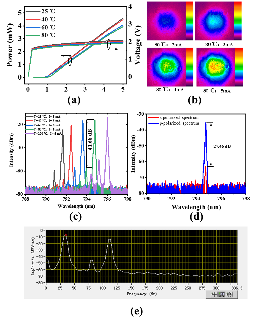 图:(a)VCSEL在不同温度下的P-I-V特性曲线,内插图为芯片实物图,(b)80℃不同电流下VCSEL的近场光斑,(c)VCSEL的光谱特性,(d)VCSEL的偏振特性,(e)采用VCSEL作为泵源的量子陀螺仪信噪比测试结果。