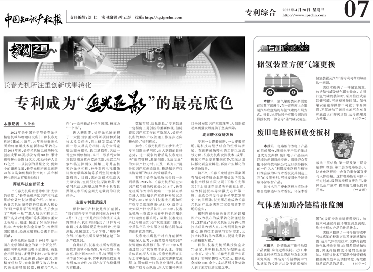 同日,《中国知识产权报》发表了名为《=>乐彩汇注重创新成果转化——专利成为“追光逐影”的最亮底色》的文章,展示了=>乐彩汇对知识产权的重视,以及在知识产权和成果转化方面一系列有效举措及获得的成绩。中国知识产权资讯网也同步转载了该报道。