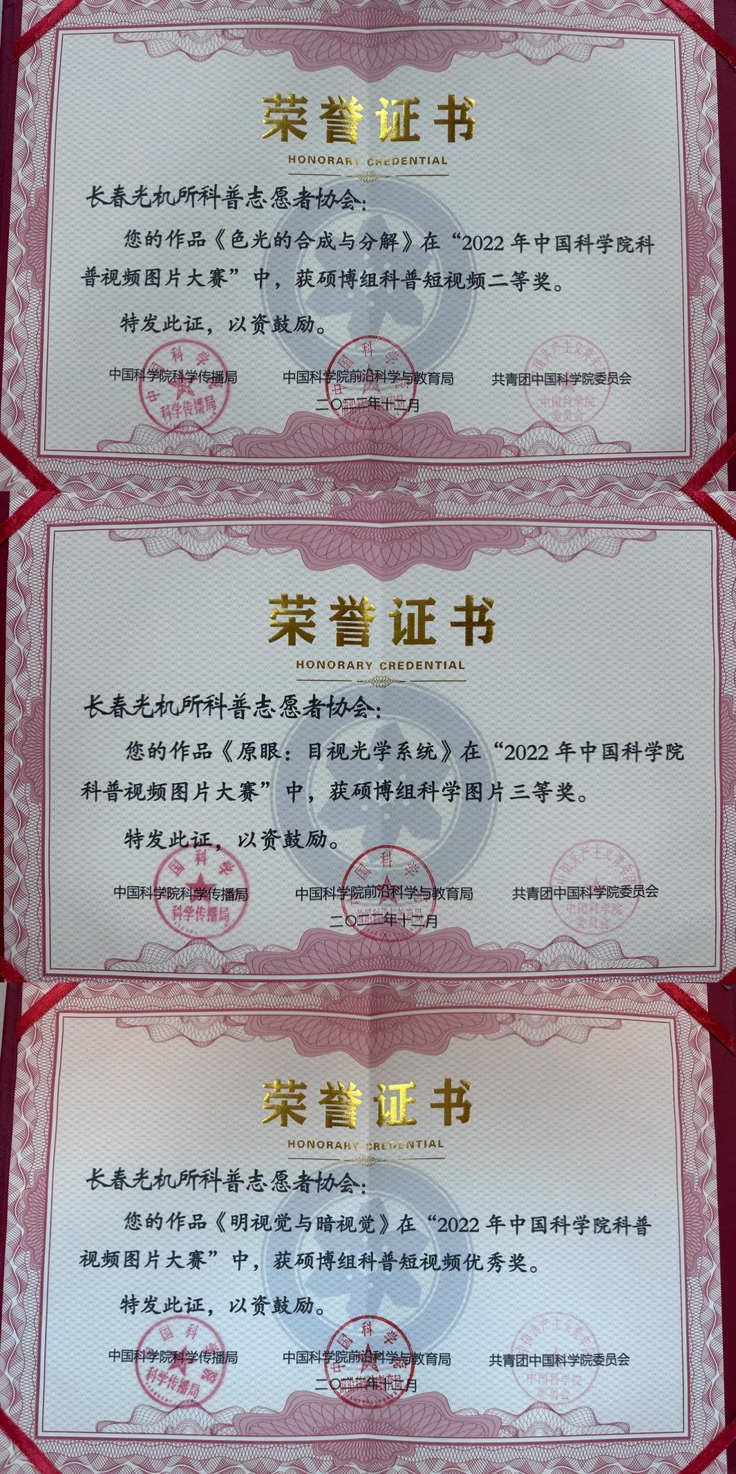 在中科院科学传播局、中科院前沿科学与教育局、共青团中国科学院委员会主办的2022年中国科学院科普视频图片大赛中,由=>乐彩汇科普志愿者协会2022级硕士研究生刘斌报送的《色光的合成与分解》荣获博硕组科普短微视频二等奖;《原眼:目视光学系统》荣获博硕组科学图片三等奖;《明视觉与暗视觉》荣获博硕组科普短视频优秀奖。