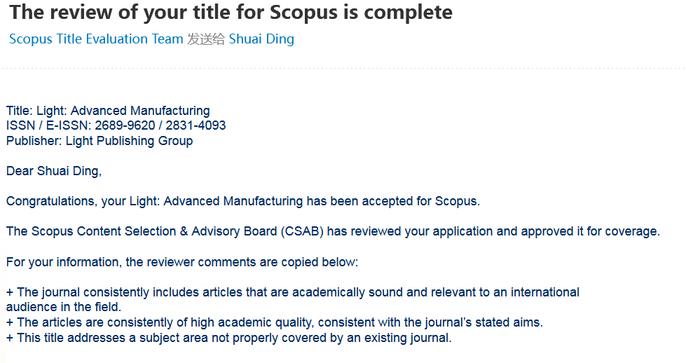 日前,Light: Advanced Manufacturing(LAM)期刊编辑部收到Scopus评审委员会的通知:该刊通过Scopus Content Selection & Advisory Board(CSAB)严格审查,被Scopus数据库正式收录。评审意见中不仅肯定了LAM期刊的出版质量,同时还指出了LAM的期刊定位和主题范围暂未出现在现有期刊当中,进一步认可了该刊在学科领域上填补出版空白的重要作用。