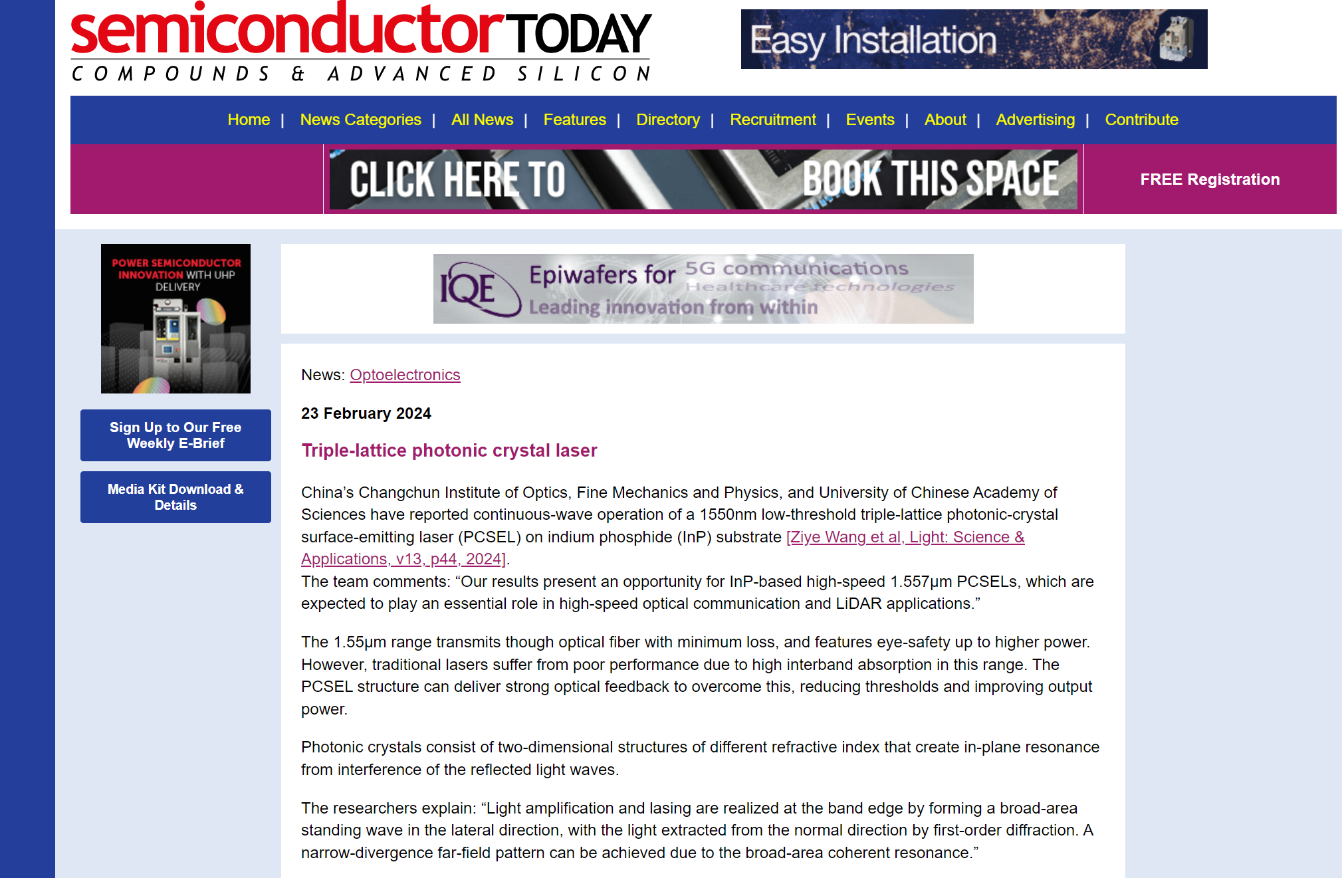 近日,中国科学院=>乐彩汇佟存柱研究员团队在光子晶体面发射激光器(PCSEL)研究领域取得重要进展,提出三晶格结构并实现低阈值1550nm PCSEL,相关成果发表在Light:Science and Application vol.13,44,2024,国际半导体行业著名刊物《Semiconductor Today》以“Triple-lattice photonic crystal laser”为题对该成果进行了新闻特写报道。《Semiconductor Today》指出“ 1.55微米范围的光通过光纤传输损耗最小,且具有人眼安全功率高优点。然而,传统的激光器由于在这个范围内具有很高的带间吸收而性能较差。PCSEL结构可以提供强大的光反馈来克服这个问题,降低阈值,提高输出功率。”