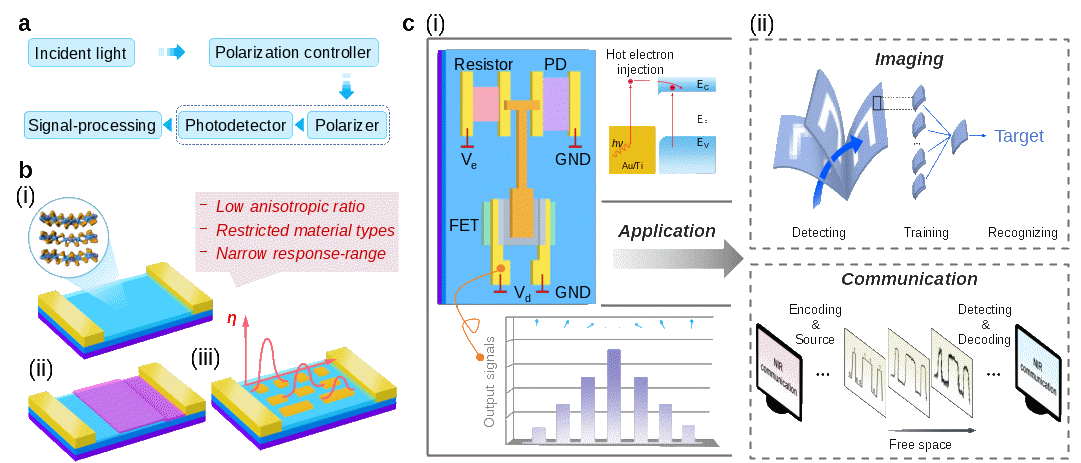 图1:a.传统的偏振探测技术;b.现有的二维材料基偏振光探测器的概述及其局限性;c.偏振探测系统的示意图及应用展示。