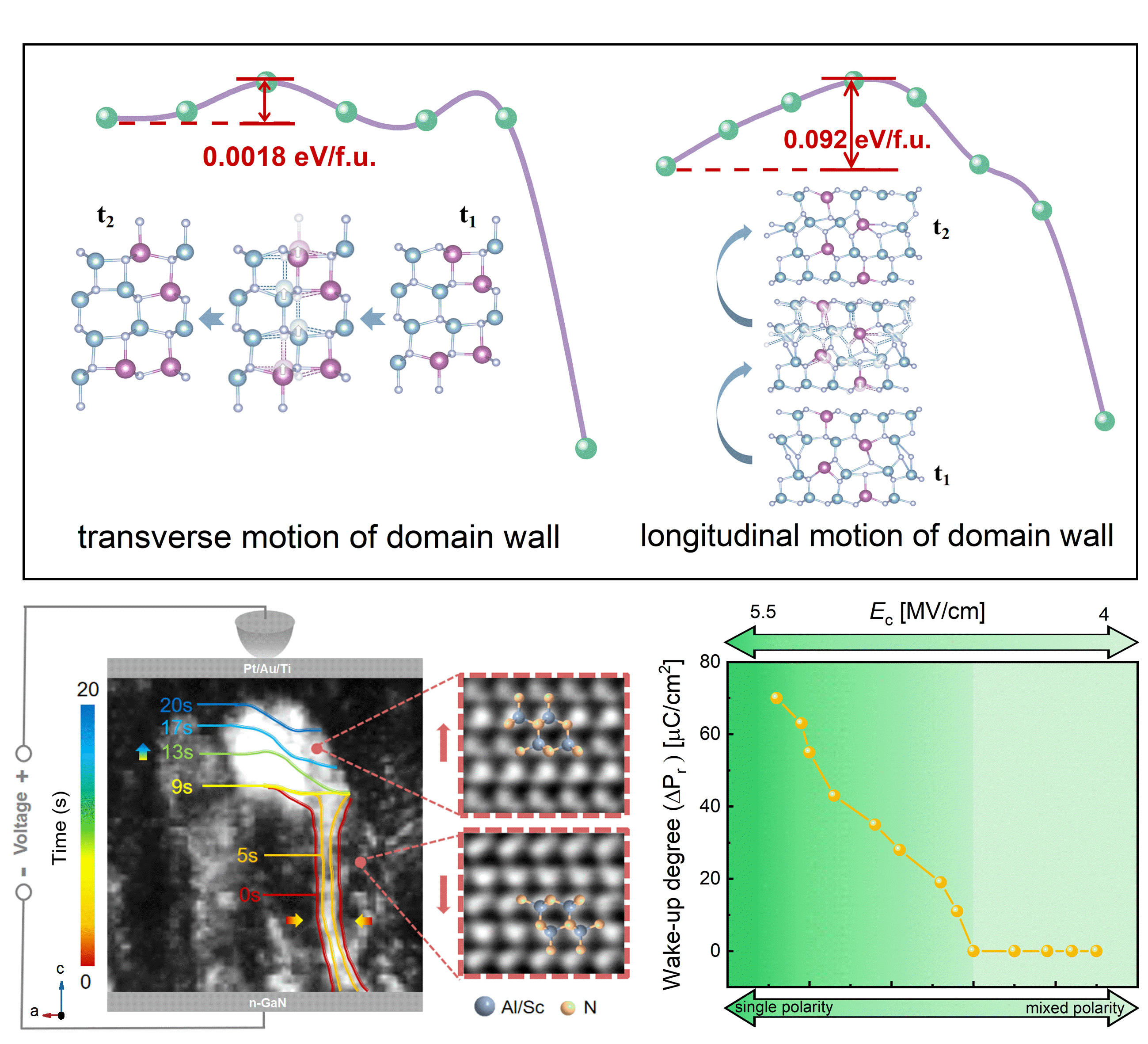 以AlScN为代表的纤锌矿氮化物铁电材料具有强自发/压电极化性能、强铁电性能、高居里温度、CMOS兼容等优势,解决了传统氧化物铁电体铁电相不稳定、难以与主流半导体工艺平台相兼容等应用瓶颈,在5G通信、电力电子、人工智能等领域具有广阔应用前景。然而,由于其极化反转涉及金属-氮原子协同迁移,纤锌矿氮化物铁电体的畴动力学相较于传统氧化物铁电体(单原子移动)更为复杂,导致其具有较高的极化反转势垒,面临高矫顽场和唤醒行为等问题,制约其大规模应用。因此,深入理解这一新型铁电材料极化反转过程中的畴运动机制,以最小的能源成本调控畴壁运动,是这一体系亟需解决的关键科学问题。