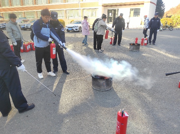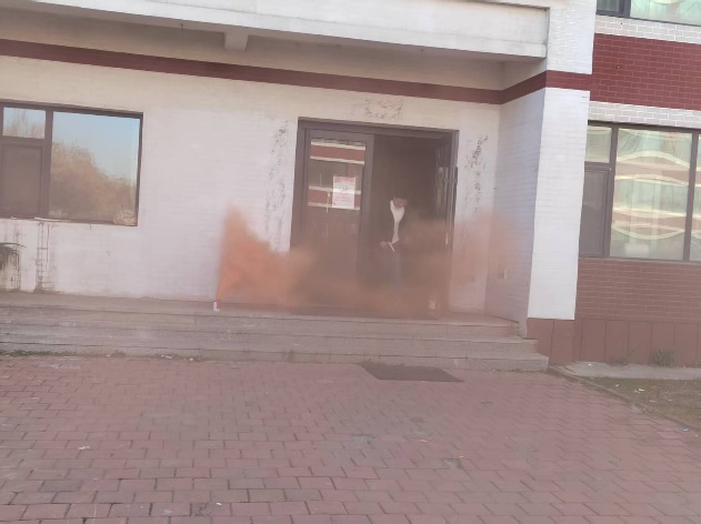 12时55分,研究生部各公寓楼声光警报响起,同时拉开公寓楼下消防演习专用烟雾弹,演练正式开始。研究生们听到警报声后按照指定路线快速有序地撤离到安全区域。到达指定安全区域后,警队人员为研究生讲解干粉灭火器和二氧化碳灭火器的使用方法及注意事项,消防栓的使用流程及水带的连接方法,并指导同学们进行灭火器灭火实操演练。